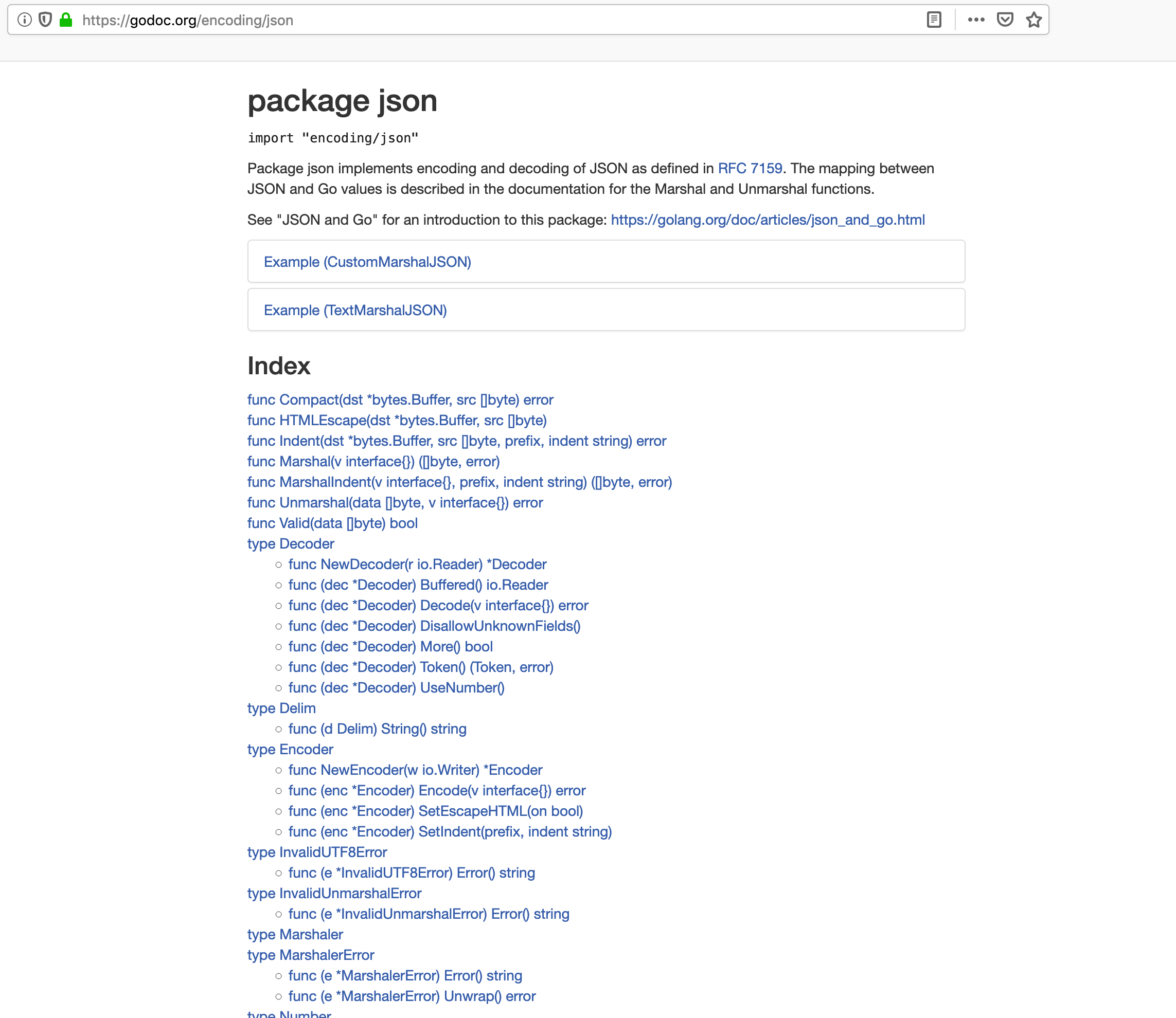 Here’s what it looks like for theencoding/jsonpackage (Go’s standard JSON library):