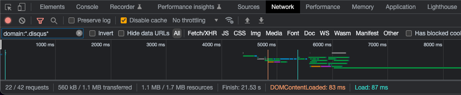 560 kB / 1.1 MB of data transfer and 23 / 44 requests were due to Disqus alone.