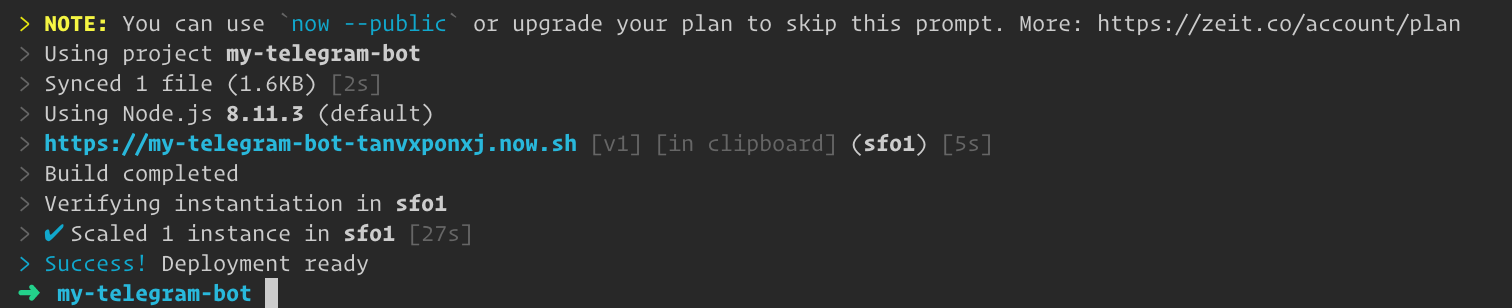 Great! This means your server is deployed on https://my-telegram-bot-tanvxponxj.now.sh (or whatever link you see instead), and your API would be present on https://my-telegram-bot-tanvxponxj.now.sh/new-message (as defined in index.js)